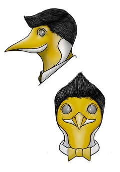 First things first, we went back to pen on paper, and got some sketches going of what we wanted in the new-look Penguin. We needed more Elvis, less Mr. Clean, but that still left a *lot* of room to maneuver. We tried a lot of different looks, sticking with a pretty consistent facial structure, but trying on a lot of different hairstyles. Each 'do presented pros and cons, from how the style contoured to KP's head, to how it looked from a straight-on shot, to how difficult it would be to texture it in 3D form. Out of all these designs, we settled on a couple, and went towards the next steps.